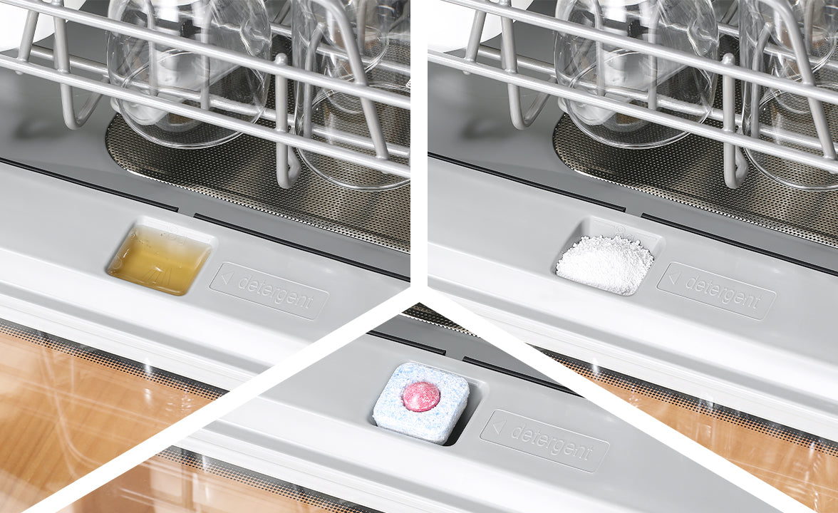 All types of detergent work perfectly and deliver sparkling cleanness.